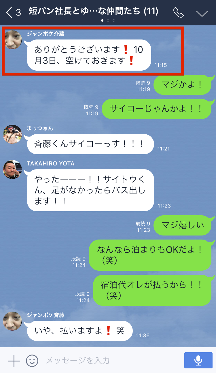 でもね。今回はボクだけじゃなくってね。短パン社長を中心としたLINE仲間のグループにお笑い芸人ジャングルポケットの斉藤慎二くん( 以下、サイトウくん )が混ざって、みんなで盛り上がる!というなんとも無茶苦茶な企画(笑)
