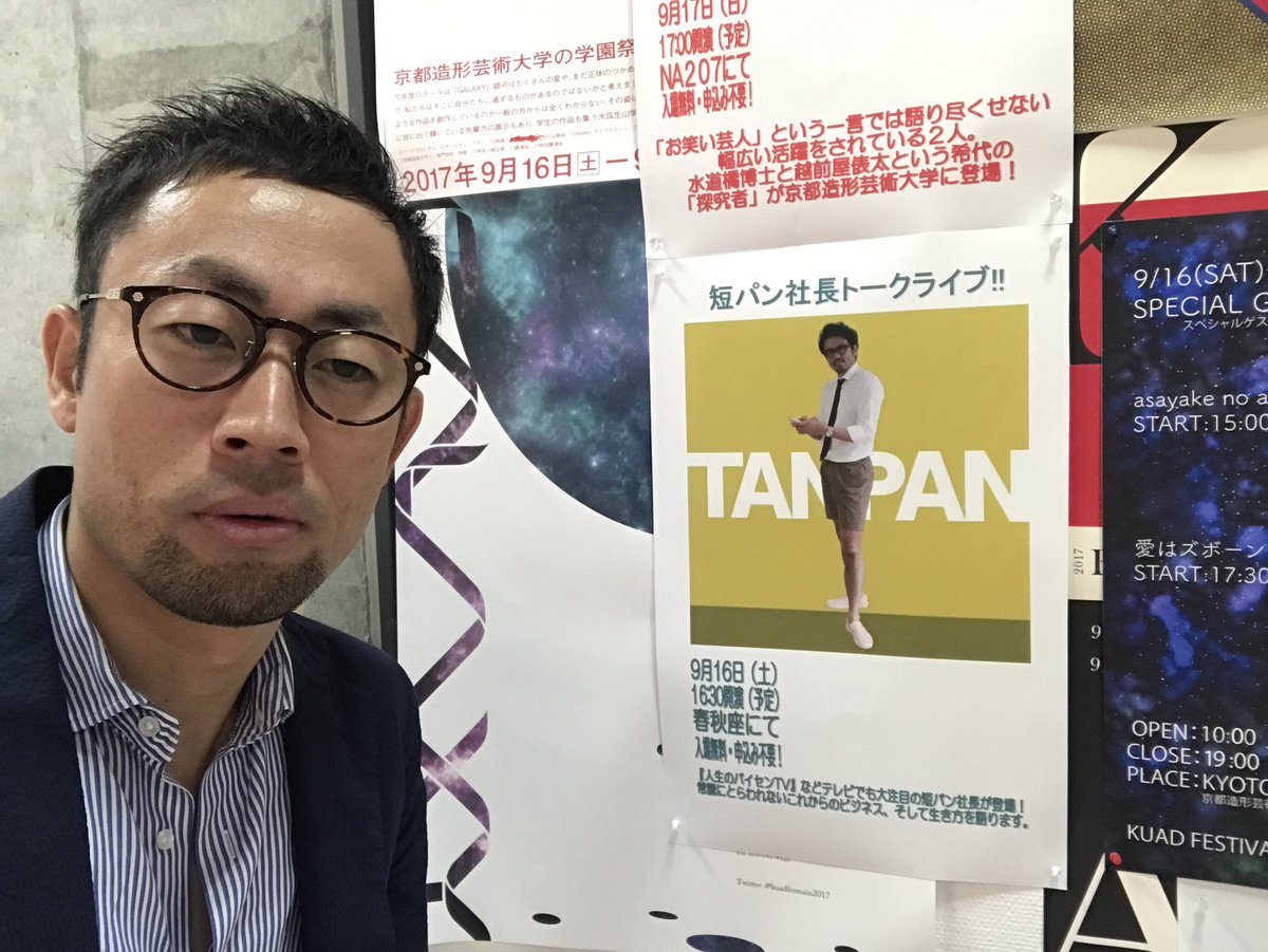 来週 9/16 16:00〜京都造形芸術大学にてトークライブ開催やで!!https://t.co/NzWyuyTw6V#短パン社長 pic.twitter.com/OS0dn1oBEP— 清水 雄一郎 菓子缶メーカー フツー社長 (@shimizuman15) September 8, 2017