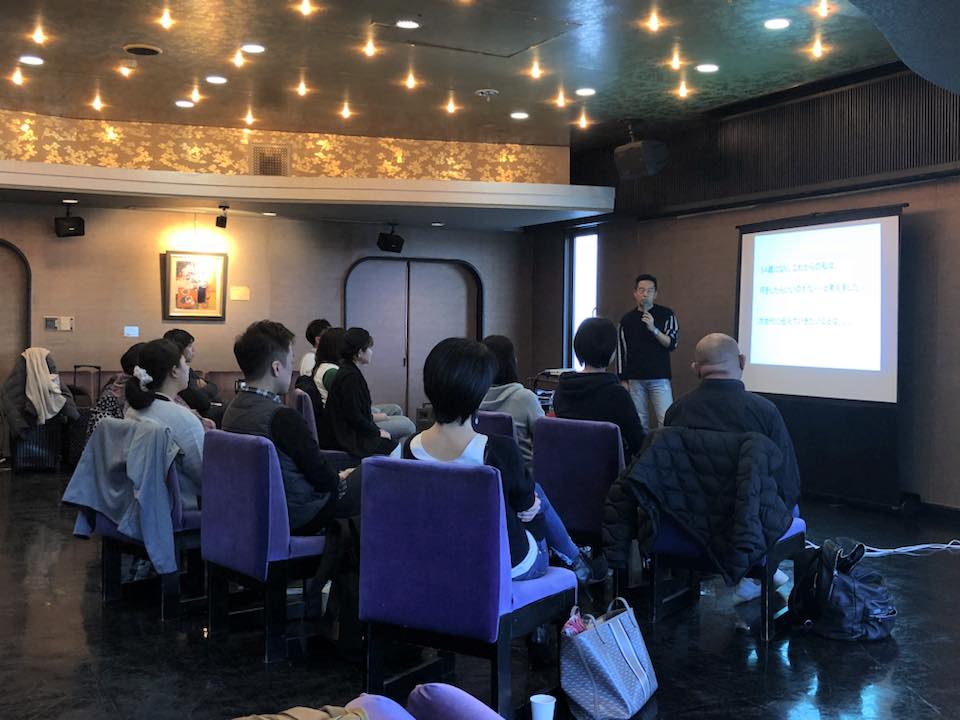 はなぶさ旅館にてエヴァ合宿2日目。泣いても笑っても今日が最終講です。昨日は半分の6名が発表。今日は残りの6名がそれぞれ発表します。半年間の集大成です。