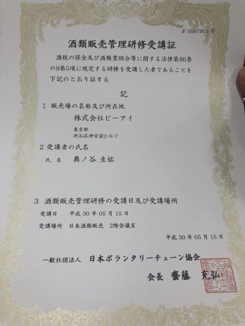 酒類販売管理の免許取得しました!これで心置きなく短パンビールが皆さんへ販売できます!