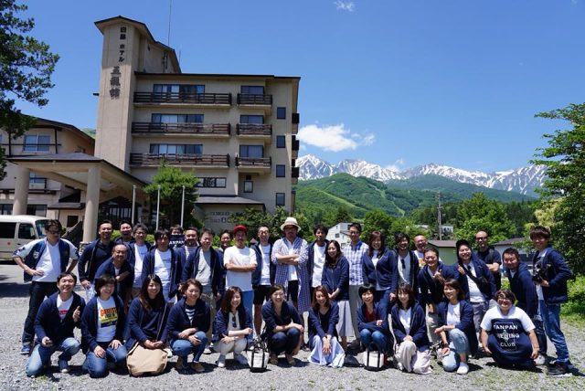 ホテル五龍館と白馬八方を背景に短パンビール部のみんなで集合写真