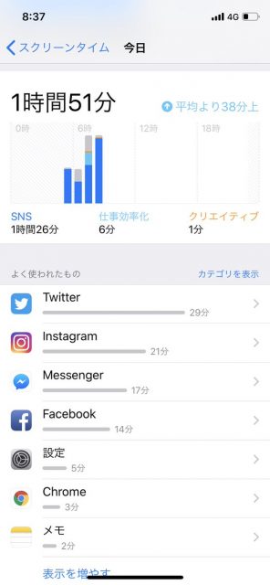 でね。今日はその話ではなくて、こないだヒラヤマから教えてもらったけど、iPhoneアップロードしたらスクリーンタイムってのがあって今日1日とか1週間とか、自分が何を使用してるのかが全部出てくる。オレの場合は朝起きてから既に1時間半以上SNSに時間を費やしてる笑