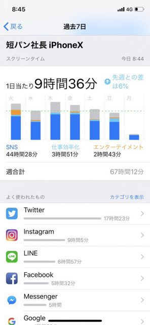 なにげにLINEが多いのがビックリ。あとはグーグルの時間が多いのはAmazonプライムかと。U-NEXTはちゃんと表示されるのにな。 それにしても仕事の効率悪っ笑