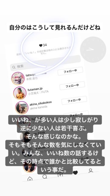 これにより、いいねがある程度多かった人は若干寂しがり、少なかった人はちょっとだけ喜んだりするのかな。でもそれって結局数字に固執してたって事になる。「 オレはあの人よりいいねが多い。だからスゴいんだ。」「 私はあの人よりいいねが少ない。だからダメなんだ。」って、誰かと比較してる。SNS疲れとかもそこから出てきたりしてる。だから人と比べて落ち込んでた人にとっては若干明るい兆しになるんじゃないかな。逆に、人よりいいねの数が多いことをみんなに伝えたり、わざわざセミナーとかで「 いいねが100以上 」みたいな話をしてた人は、もう使えないね。いいことだ。ざまーみなさい。
