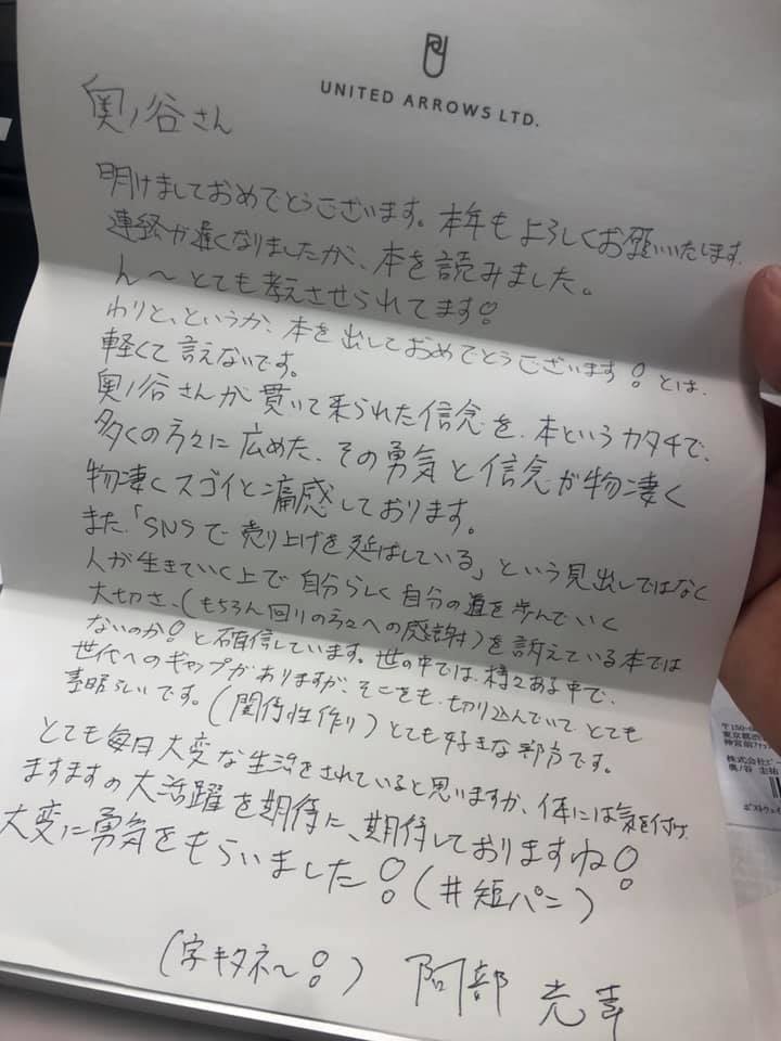 そんな短パン本にも載ってるユナイテッドアローズの阿部ちゃんが「 本読みました!」ってわざわざ手紙を送ってきてくれました。普段LINEでやりとりしてるのにね。こういう気持ちが嬉しいです。