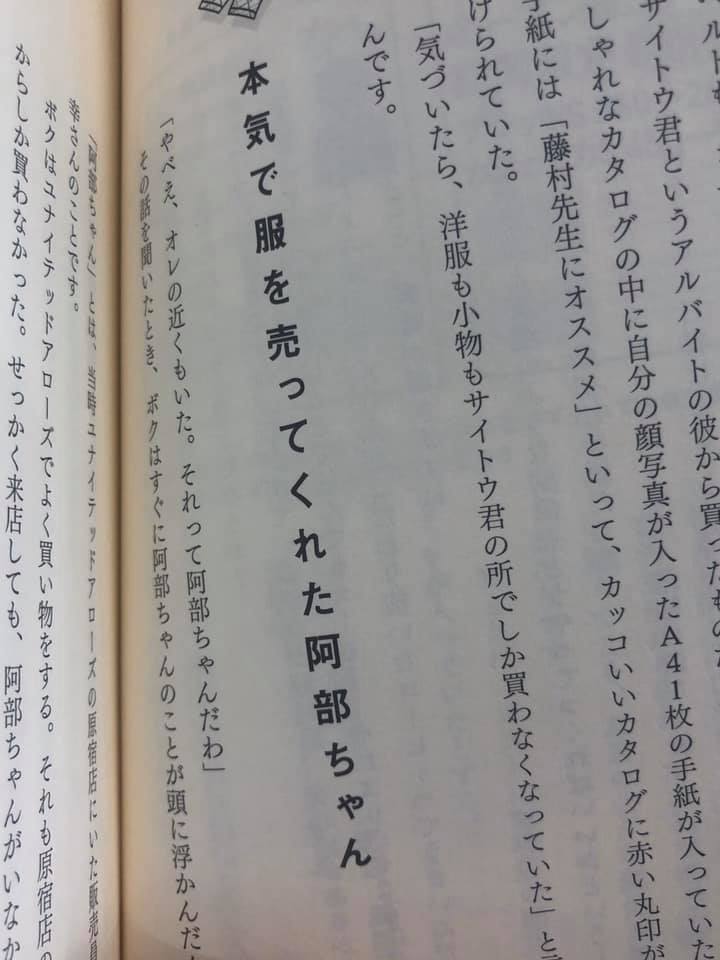 で、それからオレが友人を阿部ちゃんところに連れて行くと、ユナイテッドアローズじゃなくて、古着屋紹介されたり、人によっては点数付けられたり、洋服買う前に美容院行きましょう!って、洋服買わせてもらえなくて、美容院の前まで連れて行かれ、ここで切りましょう!って。え?阿部ちゃんはここで切ってるの?って聞いたら「 いや、切ったことないっす!」って、もうホントぐちゃぐちゃ笑笑
