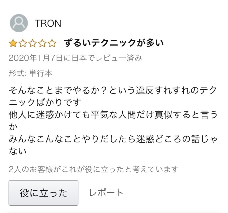 どう考えてもオレのこと知ってて、オレのことキライになった人のレビューやん。でもどんな意見も役に立ったのボタンは押すので。ちょっとどの辺が違反すれすれだったかもう1回本見て確認します!!