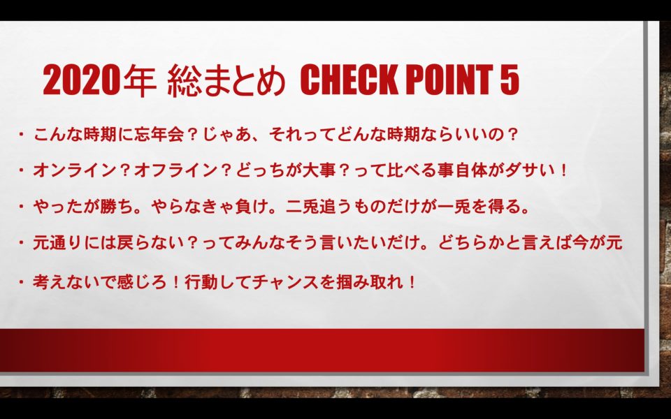 これも毎年年末に伝えていることですが、来年はどんな年になるのかな。ではなく、どんな年にしようかな。という意識を持とう。全ては自分の行動次第。
