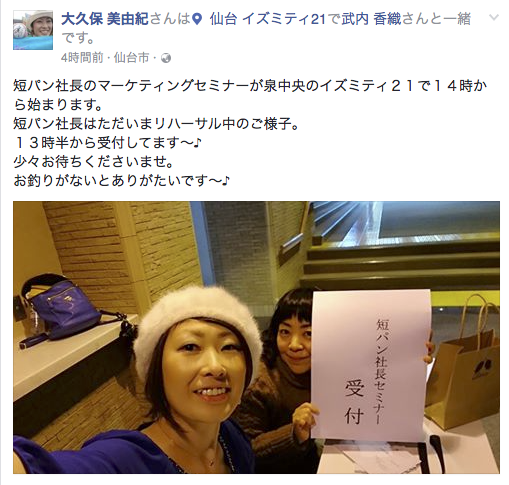 藤村正宏先生との出会いからのお話。会場の雰囲気が変わった瞬間 #短パン社長 pic.twitter.com/R6zaR8jv0A— 米沢の2人専用お宿の女将 あやこ (@SumireAyatchi) January 18, 2017