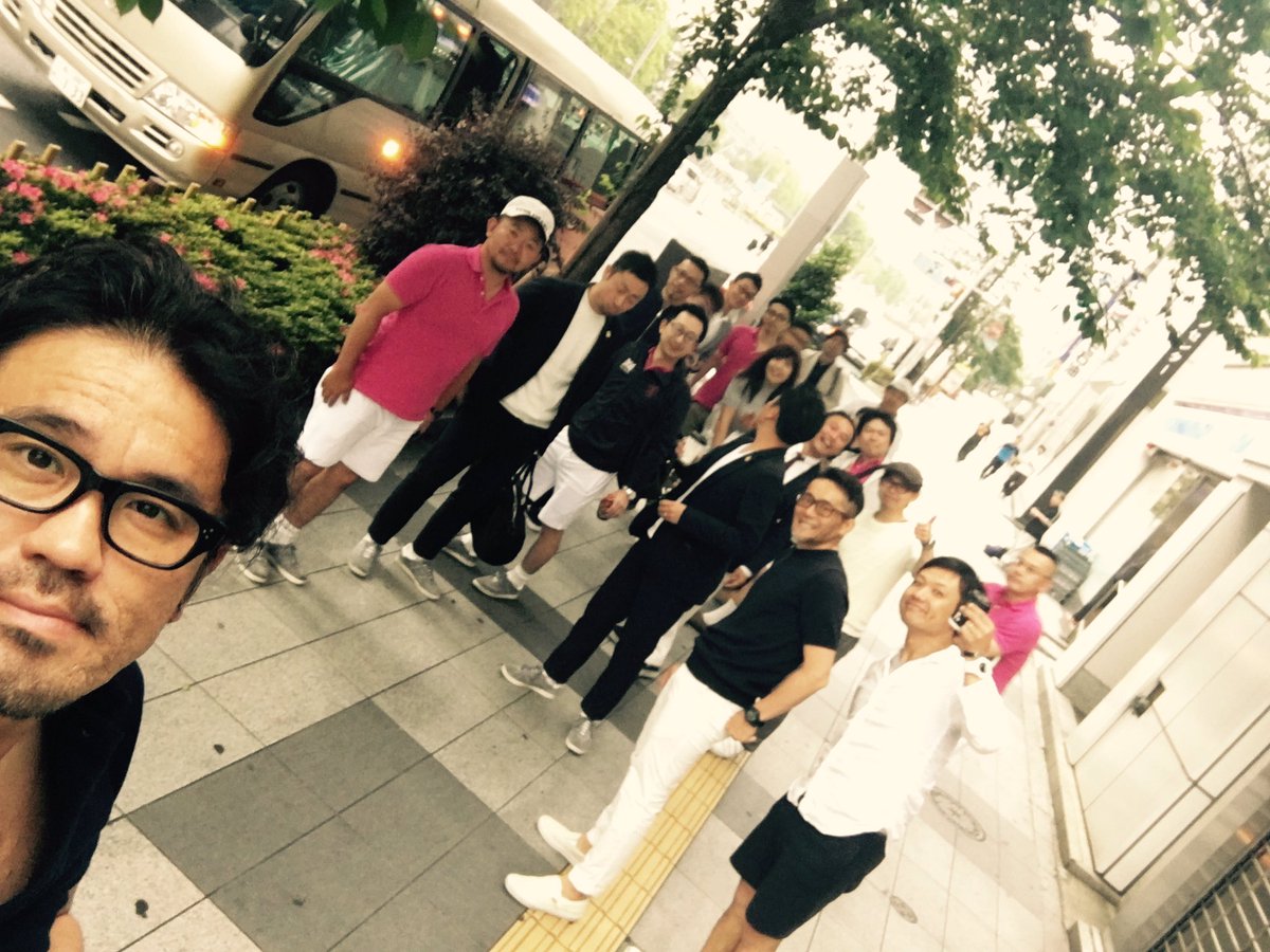ね。もう朝から楽しそうでしょう。Keisuke okunoyaのポロシャツ、短パンを参加者全員で着てゴルフ場を占拠。想像するだけで震えます。
