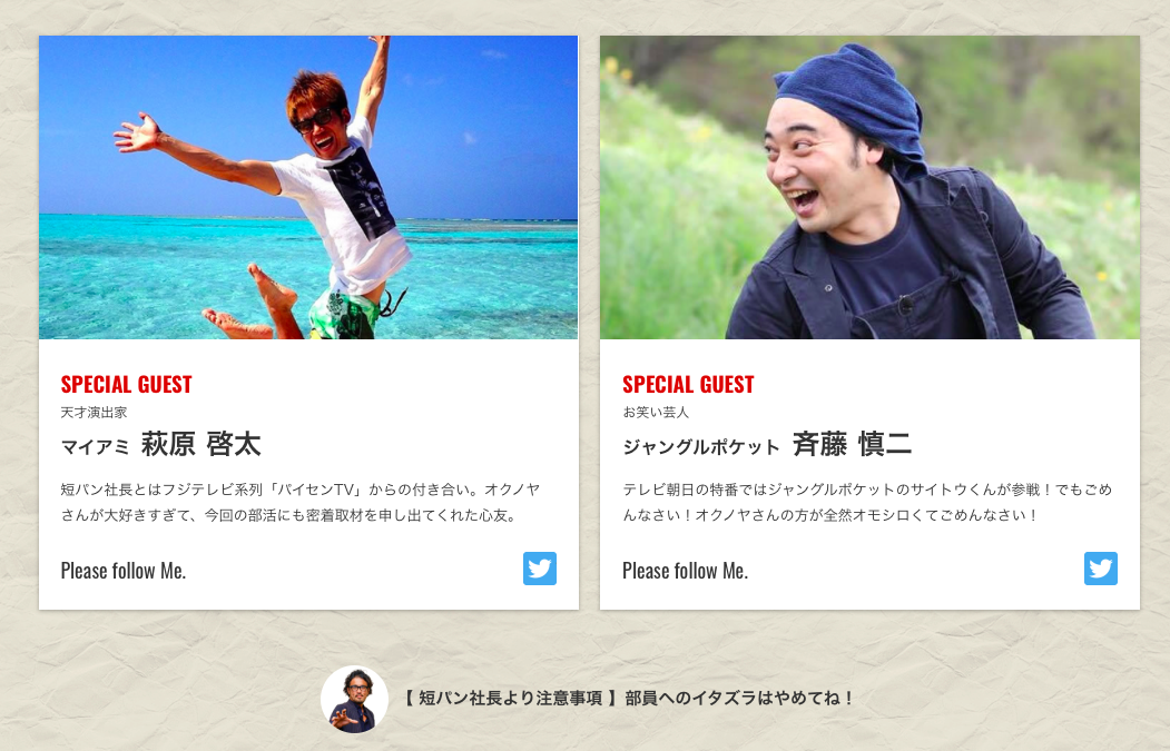 1回目の時のフォトギャラリーはもちろん、部員みんなのSNS状況や活動報告のブログなど。見所が満載になっています。スペシャルゲストのところにはマイアミやジャングルポケットのサイトウくんまで載っています。