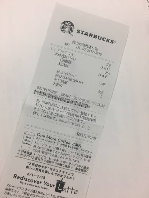 スタバではドリップコーヒー購入時のレシートを当日まで
