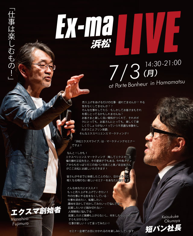 その理由をボクなりに話しますと。ボクなりにですよ。そのセミナーは何の為のセミナーか?っていう事です。先日の豊橋のコラボセミナーは、松林のかっちゃんとてっちゃん主催。エクスマ大好きな人達に向けての第2回目という事もあり、登壇する事になりました。今回の浜松もそうだと思ってます。主催者のお客さま向けだったり、主催者のスタッフ向けだったり。
