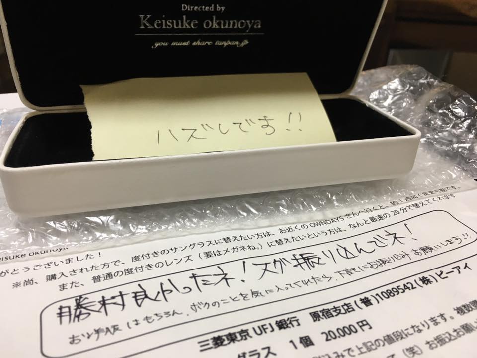 はい。この1ツイートで何人の方からご注文がきたと思います?その数、ざっと50人です。20,000円のサングラスが瞬く間にオーダーが入りました。2本目が欲しい!って言う人、買い逃した人、様々ですが、多めに作ってくれたとはいえさすがにそんなに余ってません(笑)なので、何人かの人達には諦めてもらう事になっちゃいます。ごめんなさい。