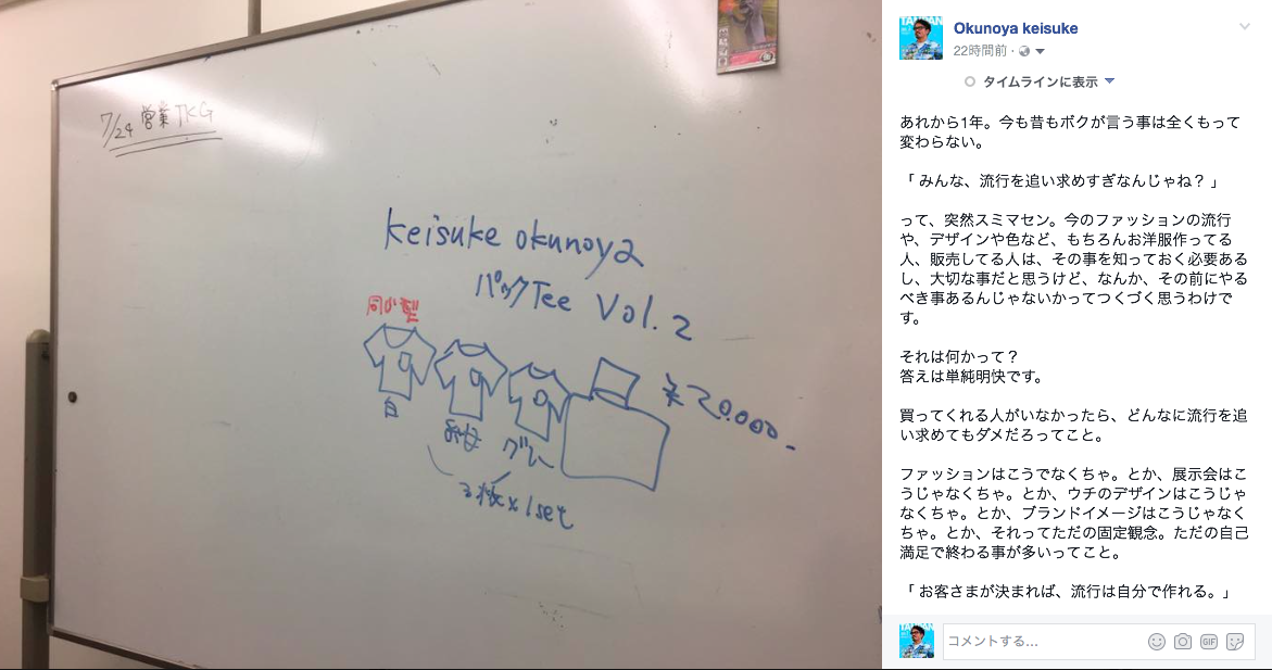 あの伝説の事例から約1年「 Keisuke okunoya パックTシャツ 」第2弾が満を持して発売決定!