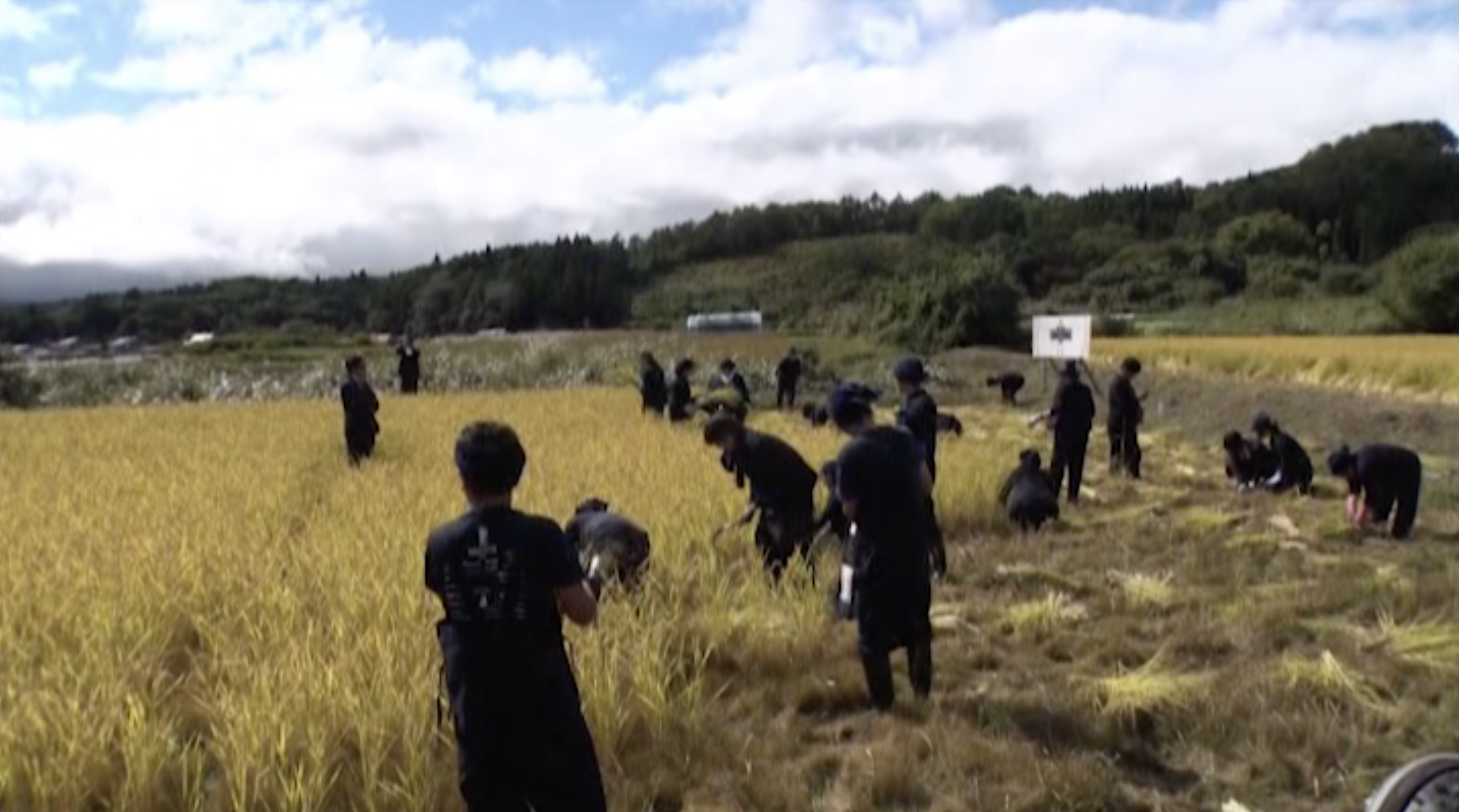 稲刈りのシーンも