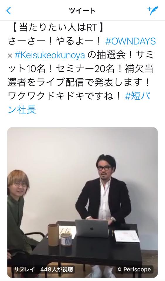 さーさー!やるよー! #OWNDAYS × #Keisukeokunoya の抽選会!サミット10名!セミナー20名!補欠当選者をライブ配信で発表します!ワクワクドキドキですね! #短パン社長 https://t.co/UrPZlPluNe— 短パン社長 奥ノ谷 圭祐 (@Okunoya_jr) January 15, 2018