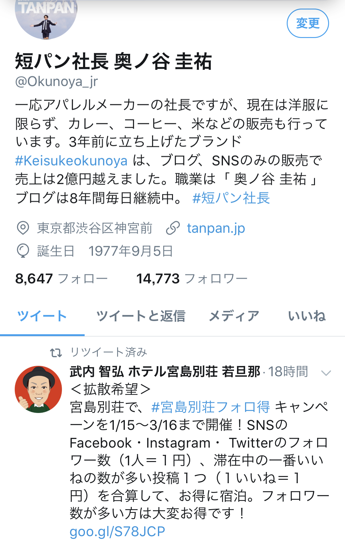 SNS上の「 フォロ割が流行ってる。」「 でもちょっと違うんじゃないの? 」的な意見はシカト。つーか、流行ってるって、ボクが知ってる限りはこの3社しか知らないし。だって客観的に見てよ。あなたはそりゃ、ボクのブログやSNSを見てくれてるからフォロ割について知ってるかもしれないけど、ほとんどの人はこの事をまだ知らない。だから宮島別荘のフォロ得でこのキャンペーンを知る人もいるわけですから。良いと思ったらすぐにやってみる。( マネてみる )この行動こそが素晴らしいと思います。