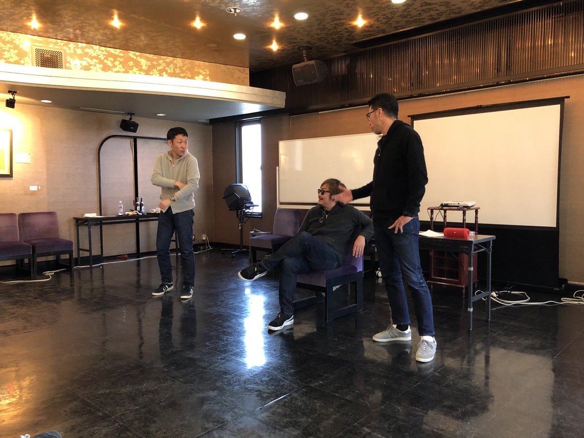 はい。たしかに。もうできないです(笑)その前にこれ本当にセミナーなのか?と問いただしたくなるくらい、いい大人たちがここに集結しよくも8カ月間も練習をしたものです(笑)ボクたち劇エヴァメンバーは「 エクスマの新春セミナーであの舞台に立ちたい! 」と思い、この劇エヴァに参加したのはもちろん大きな理由の1つですが、なによりも主宰である藤村先生が、大学時代に勉強もせずに演劇ばかりしていた師匠が「 楽しいことしたい!なんか面白いことしたい!」って子供のようにキラキラした顔で言うんですもん!その想いに応えたい!相乗りしたい!って思って参加した!もしかしたらみんな、それが一番の理由なんじゃないかな?!