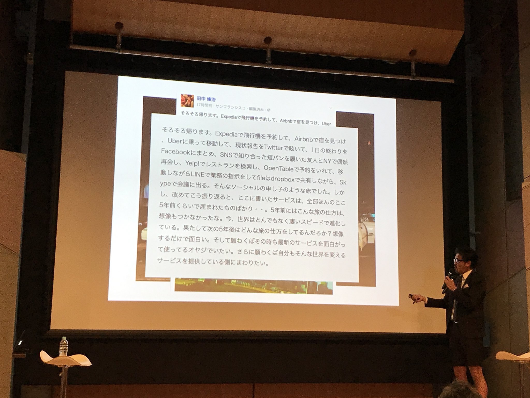Expediaだって、Airbnbだって、Yelpだって、Uberだって、日本で流行る流行らないは別として、あっという間に目の前にある現実となっている。また、ボクたちが日頃使ってるFacebookやTwitterだってそう。ただ使い倒せばいいか?って言ったらそうじゃない。ちゃんと自分で考えて発信してるかってこと。その質は上がったのか?結果は出たのか?出てなかったらそれは使い方に問題があるわけだから自分の考えを変えなければいけないわけです。未だに今挙げたSNSやサービスを知らない人はごまんといます。だからってそれに合わせてていいのかって。それじゃあ、3年前と同じじゃん。結果動かなかったらただの知識として残るだけ。使わなかったらやってないのと同じ。その事を感じでもらうだけでも、ボクが話した価値はあるかな。って思ってます。