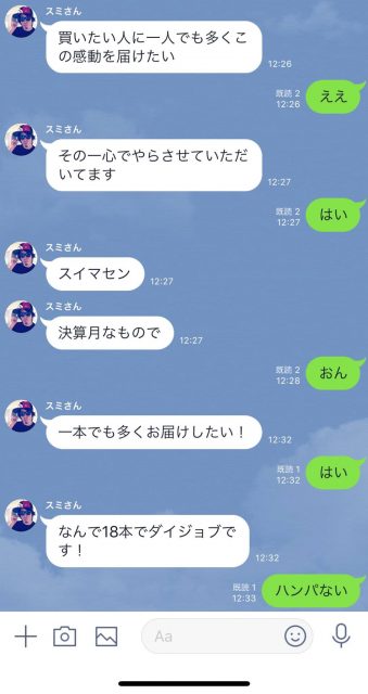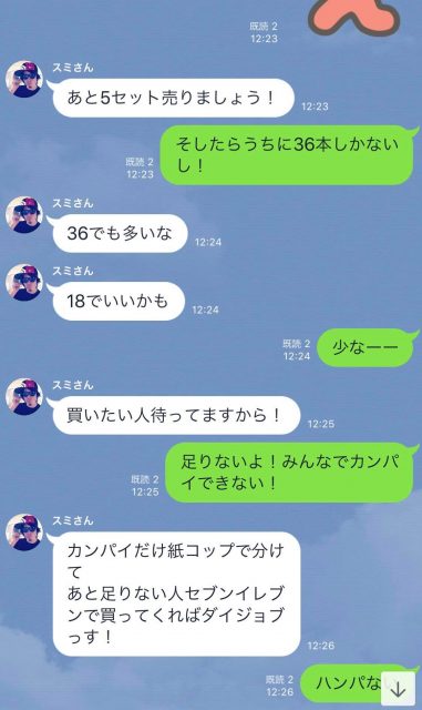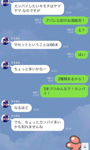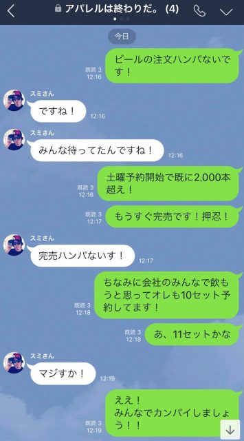 間もなく完売しそうな( 今日中にカウントダウンできるかなー! )話題沸騰中の短パンビールですが、ボクも社員のみんなに飲んでもらいたくてたくさん予約している事をスミさんにLINEで報告してみたら、まさかの返信が返ってきました。
