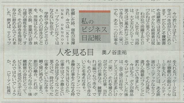 繊研新聞のコラム「 私のビジネス日記帳 」の第3回目(最終回)は、人を見る目について。
