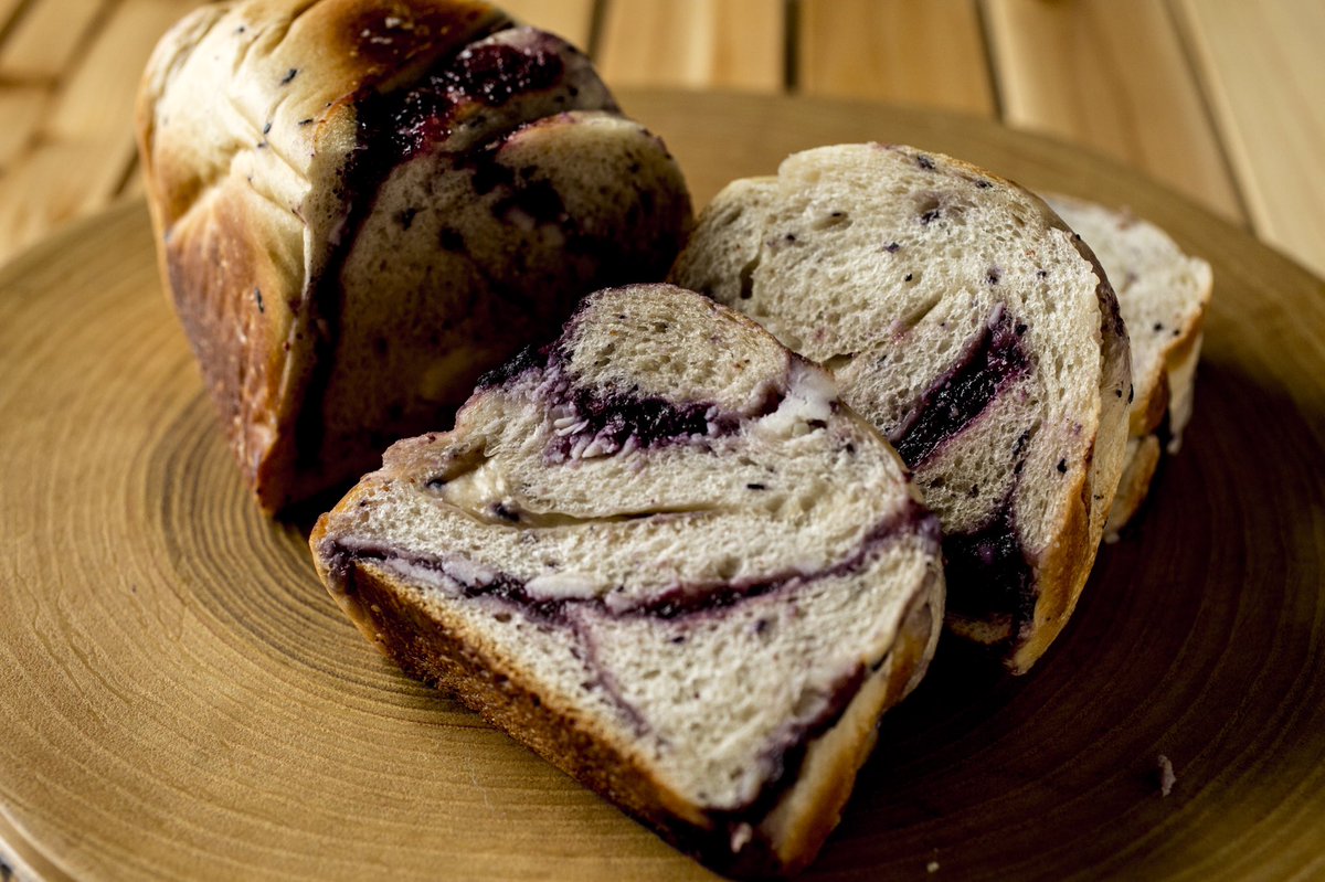 宮島ブルーベリーブレッド ¥1,100(税込)当店一番人気!ブルーベリーを惜しみなく生地に練り込みブルーベリージャムとクリームチーズを贅沢に使った一押しの商品です。そのまま食べても美味しく、お土産にも喜ばれる看板商品です。